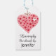 Ein rosafarbenes Herz mit verschiedenen roten Punkten ist auf diesem Produkt abgebildet. An der Oberseite ist ein kleiner roter Bogen, der im Loch endet, in dem dieses Produkt an Ihrem Geschenk befestigt wird. Unter dem Herzen, in verschiedenen Schriftart gedruckt, sind die Worte: liebevoll handgefertigt von: Jennifer (der Name ist anpassbar). Die gegenüberliegende Seite dieses Produkts wird für eine personalisierte Notiz leer verlassen.