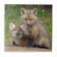 Zwei rote Fuchskits teilen sich einen Moment außerhalb ihrer Höhle.