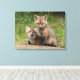 Zwei rote Fuchskits teilen sich einen Moment außerhalb ihrer Höhle.