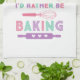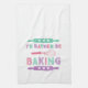 Ein süßes Küchentuch für die Bäckerin in Ihrem Leben mit "Ich backe lieber" in einer lustigen Retro-Schrift mit Illustrationen von Nudelholz und Schneebesen in Rosa, Lila und Türkis.
