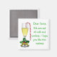 Spaß kleiner Weihnachtsmagnet, mit einer Notiz an den Weihnachtsmann. Ein festlich dekoriertes Weinglas, mit goldenem Bogen und einem Hauch von Heiligen, am Stamm und einem an der Kante aufgehängten Bonbonkon, schmückt diesen lustigen Urlaubsmagnet. Eine niedliche Anmerkung an den Weihnachtsmann liest, Lieber Weihnachtsmann, Wir sind aus Milch und Kekse, ich hoffe, Sie mögen dies stattdessen. Personalisieren Sie, wenn Sie den Text gewollt, um etwas Anderes zu sagen.