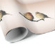 Dieses Packpapier enthält ein Paar Hausfinken, die auf einem Zweig befestigt sind. Das Männchen hat rotes Abstürzen auf Kopf und Brust. Das Weibchen ist bräunlich und braun mit Streifen. Sie heben sich wunderschön vor dem metallischen Hintergrund der Bronze hervor.