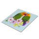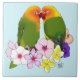 Zwei Liebesvögel auf einem Baumzweig mit rosa, weißen, gelben und violetten Blumen in einem blauen Hintergrund