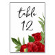 Helfen Sie Ihren Gästen mit dieser eleganten roten, blumengeschmückten Tischkarte, ihre Sitzplätze zu finden. Die Buchstaben und Zahlen befinden sich in einem Skript-Schriftart, während eine Blumenstruktur unter dem Text steht.