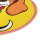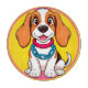 Illustration eines glücklichen Cartoon-Hundes mit ausdrucksvollen Augen, mit einem dekorativen Kragen und mit einem bunten kreisförmigen Hintergrund. Ideal für Designs mit Haustieren, Kinderkunst oder spielerische Grafiken.