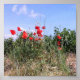 Dieses Foto wurde Anfang Juni in Südfrankreich aufgenommen. Die Mohnblüten wuchsen am Rande eines Weingartens mit einem schönen blauen Himmel dahinter.