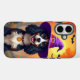 Adorable Hund, wahrscheinlich ein Cavalier König Charles Spaniel, mit einem pulsierenden lila Hexenhut. Der Hund hat einen fröhlichen Ausdruck und zeigt seine spielerische Natur. Um den Hund herum sind bunte Herbstblätter und geschnitzte Kürbis, die das Halloween-Thema verstärken