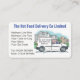 Kleine Unternehmen Hot Food Takeaway Lieferfirma mit Namen auf einem Firmenwagen. Farbbild eines Fahrers am Rad eines weißen Van. Auf beiden Seiten der Visitenkarte wird eine Illustration angezeigt. Ideal für einen Geschäftsbereich Gastronomie oder für den Abholdienst von Abholservice und Van CallingCard.