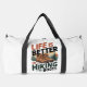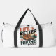 This white garment features the adventurous text "LIFE IS BETTER in Hiking Boots" in bold and cursive fonts. An illustration of sturdy brown hiking boots is set against a scenic backdrop of mountains and pine trees, suggesting a love for outdoor exploration and nature. Perfect for hikers and adventurers.
