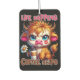 A funny and sarcastic design showcases a cute highland cow sitting with a beautiful white daisy and a to-go coffee cup. The cow, with big blue eyes and a serious expression, sports a lipstick kiss on his cheek and vibrant orange-and-white fur. The colorful text reads, "Life happens, coffee helps." This design is available on various products, making perfect gifts for coffee lovers.