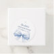 A white background color. Decorated with a large light blue colored bow. Personalize and add the name and date.