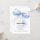 A white background, decorated with a light blue large bow and a golden cross. Personalize and add a name and details details.