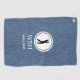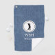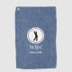 Schwarze Silhouette des Manngolfers in einem runden weißen Rahmen mit Initialen und Namen, auf einem hellblauen denim Druck Golf Handtuch. Personalisieren Sie die Initialen und den Namen, um ein einzigartiges Golfgeschenk zu schaffen und zu behalten. Sie können die Initialen in einen größeren Namen umkehren und den kleineren Namen entfernen. Verwenden Sie die einfache Vorlage, um den Text zu ändern und ihn zu Ihrem eigenen zu machen. Abmessungen: 16" x 24", 80% gewebtes Polyester/ 20% Polyamid Mikrofaser, Kräuterkrümel und geblasenen Haken inklusive. Waschmaschinenfest.