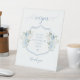 Elegant boho chic bridal shower recipe sign featuring a sweet light blue crest decorated with blue flower bloom and a sweet message inviting guests to share their favorite recipes for the bride-to-be. This modern design adds a refined touch to your celebration and is perfect for bridal shower decor, recipe card table signs, bohemian 'Something blue' themed bridal shower celebrations.