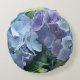 Rundes, dekoratives Sofa mit Hydrangea-Blume. Die hellblauen Hydrangeas, die in einem Garten wachsen, sind eine schöne Ergänzung zu jedem Zimmer des Hauses. Die blauen und lavendelfarbenen Blätter mit grünen Blätter sind das beiderseits bedruckte Bild dieses runden Kissens.