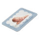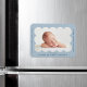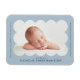 Moderner Geburtsankündigungsmagnet mit dem Foto Ihres Babys in einem hellblauen Skallopierrahmen. Personalisieren Sie den hellblauen Geburtsankündigungsmagnet, indem Sie den Namen Ihres Babys und zusätzliche Informationen in der Marine-Schrift hinzufügen.
