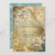 Eine hellblaue Palette liegt vor einem Kupfer/Bronze-Hintergrund im Barogue-Stil. Die Karten sind mit cremefarbenen Blume und vergoldeten Blätter über einem diamantförmigen Rahmen geschmückt.