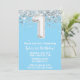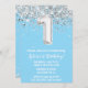 Hellblau und silber 1. Geburtstag Party Einladung 1 Geburtstagsfeier Einladung mit Glitzer und modernem Drehbuch und lustigen Folienballons.