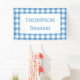 Helfen Sie Ihren Gästen, Ihr Party mit einem individuellen Banner zu finden, der einen klassischen, hellblauen und weißen Büffel-Karo-Rand mit dem Text in einem weißen Rechteck in der Mitte enthält. Ideal für Wiedersehen, Grill oder Picknick. Personalisieren Sie es in der Sidebar. Um das Design Light Blue und White Gingham Muster auf anderen Gegenständen zu sehen, klicken Sie auf den Link "Rocklawn Arts". Digitales Bild. Copyright ©Claire E. Skinner. Alle Rechte vorbehalten.