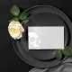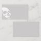 Hellgraue Halloween- oder Gotheidhochzeit-Platzkarte mit weißem Schädel und einem leeren Hintergrund zum Schreiben von Gastnamen und Tisch per Hand. Blank Goth Hochzeitsbegleitkarte in hellgrau und weiß.