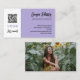 Weiße, schwarze und lila Visitenkarte für jeden Beruf mit Ihren Social-Media-Informationen in Form Ihres persönlichen QR-Codes und auf der Rückseite ein Foto. Content Creator Visitenkarte mit einem charmanten Pinselskript, lila Akzenten, niedlichen Social Media Icons und Ihrem QR Code.