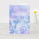 NewParkLane - Glamour Hanukkah Postcard, mit blau funkelnden, glitzernden Lichtern und Zitat "wünscht Ihnen Licht & Frieden" in einer Schrift-Typografie. Die Rückseite sagt: 'glücklich hanukkah' in blauem Schrift.