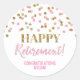 Happy Ruhestand Gunst Tag Aufkleber mit hellrosa und goldenen Konfetti Muster.