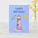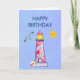 Eine Geburtstagskarte mit Wassersport-Thema. Entworfen auf einem lila Lavendel mit einem rot gestreiften Leuchtturm. Eine lächelnde Sonne und fliegende Seagull in der Weite. Mit einem lustigen Beachball am Fuße des Gebäude. Nachricht an der Innenseite, in der Sie personalisieren oder verlassen können, wie es ist.