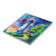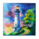 Ceramic tile in a watercolor style portrait of a lighthouse standing tall under a vibrant, star-filled night sky. Surrounded by lush green trees and soft grassy hills, its golden light glows warmly, creating an atmosphere that evokes wonder and tranquility.