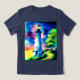 Tee in a watercolor style portrait of a lighthouse standing tall under a vibrant, star-filled night sky. Surrounded by lush green trees and soft grassy hills, its golden light glows warmly, creating an atmosphere that evokes wonder and tranquility.