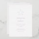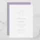 Dieses Hochzeitsdesign ist eine perfekte Mischung aus Eleganz und Strandatmosphäre. Das Hauptmerkmal des Designs ist ein kleines, silberfarbenes Stärchenmotiv aus Gold, das sich anmutig in der Mitte des weißen Hintergrunds befindet. Das Seesternmotiv ist kompakt konzipiert und fügt der Einladung eine Touch der Natur hinzu. Die verwendete Typografie ist Lavendel, was eine Touch von Raffinesse hinzufügt und sicherstellt, dass der Text leicht lesbar ist. Der Schriftart ist sauber und modern, wodurch ein zeitloses Aussehen entsteht, das nie aus der Mode kommt.