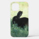 Ein kleines schwarzes Mini-Rex-Kaninchen, das im Gras sitzt.