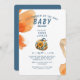 Orangefarbene Blume und blauer und orangefarbener Kürbis. L'il Kürbis auf dem Weg. Einladung der Babydusche.