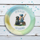 Es ist ein Lil'Slugger Baseball und Welpenhund Thema Baby Dusche Papier Teller! Niedliche Baseball-Baby-Dusche Teller. Ein kleiner Junge mit Baseballkappe und Fledermaus sitzend auf einer Bank neben einem Black Lab Welpenhund. Adorable Baseball Babydusche Papiertüte im Aquarell-Stil.