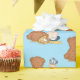 Niedliche Babydusche zum Thema Baseball oder eine Geschenkpackung zum ersten Geburtstag mit einem kleinen Baby in einer Baseballkappe und einem großen Teddybär auf einem Baseballplatz.