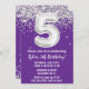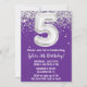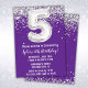 Lila und silberne 5. Geburtstagsfeier Einladung 5 Geburtstagsfeier Einladung mit Glitzer und modernem Drehbuch und lustigen Ballons.