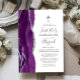 Der links Rand dieser eleganten, modernen Einladung der ersten Kommunion besticht durch eine lila Aquarellgrenze, die mit Imitaten silbernen Glitzer bestickt ist. Über dem anpassbaren Text erscheint ein Imitat silbernes Folienkreuz, das Handschrift, Copperplate und kursiv Schriftart in Holzkohlegrau auf weißem Hintergrund kombiniert. Auf der Rückseite ist ein lila und silberfarbenes Design erkennbar.