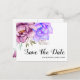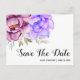 Lila, blaue Aquarellfarben Blume Foto Hochzeit Speichern Sie das Datum Postkarte. Ein wunderschönes Hochzeitsdesign mit Aquarellfarben-Blume in lila und blauen Farbtönen und Blätter. Der Satz "Save the Date" ist in Schriftzypografie enthalten.