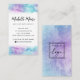 Vertikale Visitenkarten mit weichen lila und aqua blauen Aquarellbändern. Auf der Vorderseite sind anpassbare Vorlagenfelder für Ihren Namen, Titel/Firmennamen, Kontaktinformationen und Social Media und auf der Rückseite Ihr individuelles Logo. Mit dem Designwerkzeug können Sie Schriftart und Schriftart ändern, Elemente verschieben und verändern.