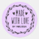 Ein personalisierter Aufkleber "aus Liebe" auf einem Lavendel lila Hintergrund, umgeben von einem Lorbeerkranz. Machen Sie es Ihren, indem Sie Ihren eigenen Namen hinzufügen. Eine schöne Finish Note für alle Ihre handgefertigten Geschenke. Entworfen für Sie von BlackBerry Boulevard.