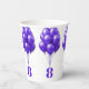 Lila Ballons Papiertassen zum Geburtstag eines Kindes. Beinhaltet sein Alter, das sich um die Tasse wickeln wird. Jede Zahl scheint einen Haufen lila Ballons zu halten.