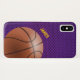 Maßgeschneiderte Basketball Fan iPhone Gehäuse, mit Grafik eines lila Sport Jersey Muster Hintergrund. Die Grafik eines Basketballkorbs schmückt den unteren Rand des Gehäuses, und der links gelbe Text kann individuell angepasst werden. Großartiges Gehäuse für Sportfans oder Basketballspieler.