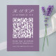 Ein einfach staubiger lila HochzeitsrSVP mit einem großen QR-Code in der Mitte und dem in Kalligrafie geschriebenen Titel. Der gesamte Text ist weiß. Es ist vertikal, portrait orientiert.