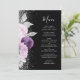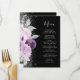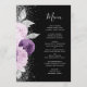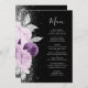 Dieses elegante, moderne Hochzeitsmenü besticht durch ein lila und lavendisches Blumendesign, das mit Imitaten silbernen Glitzer besticht. Der anpassbare Text kombiniert handgeschriebenes Skript und Copperplate-Schriftart in silbergrau auf schwarzem Hintergrund. Die Rückseite wiederholt das Blumendesign.