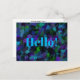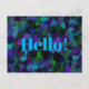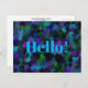 Lila, blaue, grüne und schwarze Kunst begann als Foto der bunten Federn eines Pfaues und verwandelte sich in diese farbenfrohe "Hallo!" Postkarte. Von celeste@khoncepts.com