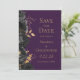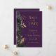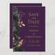 Diese elegante moderne Hochzeit speichern die Dattelkarte mit einem Rand von schwarzen Blume und goldenen Imitaten Folie Blätter. Passen Sie den goldfarbenen Text auf einem dunklen lila Hintergrund an. Die Rückseite der Karte ist lila.