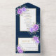 Lila Aquarellfarben Blume und Blätter Blumengoldrahmen marineblau alles in einer Hochzeitseinladung. Ein wunderschönes Hochzeitsdesign mit Aquarellfarben-Blume in lila und Blätter. Die Details sind in einem goldenen Rahmen mit einem marineblauen Rahmen. Der Riss von der RSVP-Karte kann gelöst werden.