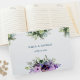 Erzählen Sie Ihren besonderen Tag mit unserem zauberhaften Lila und grünen Blumenschloss. Ein bezauberndes Blumendesign in lila und grünen Farbtönen schmückt einen unberührten, weißen Hintergrund.
