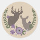 Ein Aufkleber mit einer Darstellung von violetten Blumen und Pflanzen, die die Busten eines Bucks und Doe umgeben. Suchen Sie nach passenden Hochzeitseinladungen und mehr in Jill's Paperie.