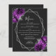Dieses elegante, moderne Hochzeitsmenü besticht durch einen silbernen geometrischen Rahmen, der mit lila und silberfarbenen Blumenbouquets auf schwarzem Hintergrund dekoriert ist. Der anpassbare Text kombiniert silbergraue, weißliche Handschrift, Kupferplatte und kursiven Schriftart. Die Rückseite ist schwarz.